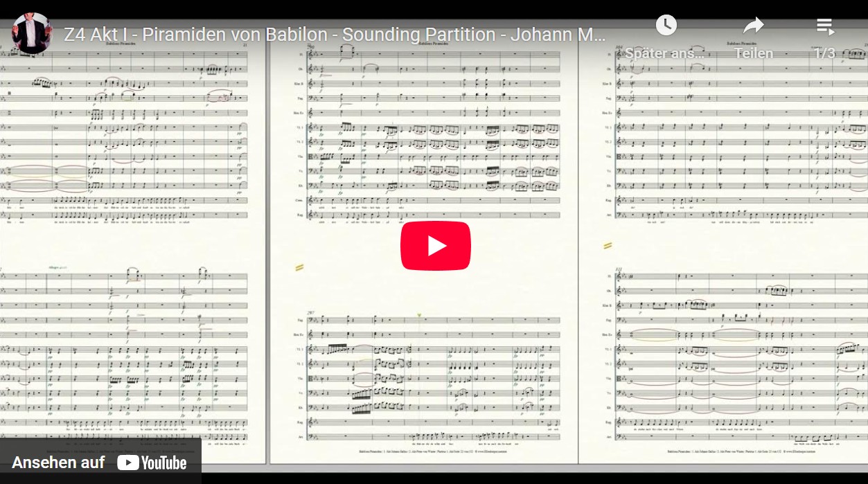 „Die Pyramiden Babylons“, oder „Der zweite Theil der Zauberflöte“. Erster Act. Den zweiten Act componirte Winter. Die Oper wurde am 23. October 1797 zum ersten Male auf dem Schikaneder’schen Theater (Freihaustheater) in Wien gegeben, und Mederitsch’s erster wie Winter’s zweiter Act zusammen erschienen im Clavierauszuge im Stiche zu Wien im Jahre 1798, im nämlichen Jahre noch bei André in Leipzig.